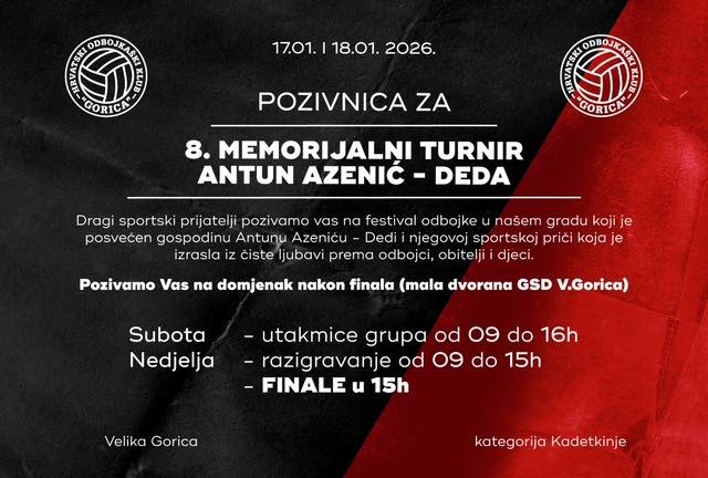 Pročitaj višePozivamo sve članice i članove na tradicionalnu odbojkašku priredbu 8. MEMORIJALNI TURNIR ANTUN AZENIĆ „DEDA“ ...