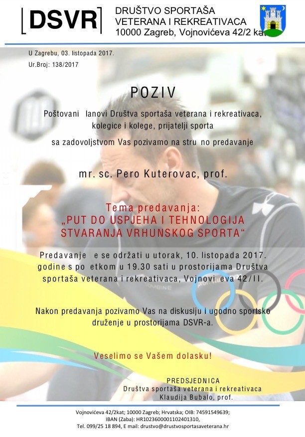 Sa zadovoljstvom pozivamo sve članove, kolegice i kolege, prijatelje sporta na stručno predavanje našeg najboljeg kondicijskog trenera, čovjeka s velikim znanjem, beskrajnom pozitivnom energijom, srdačnošću, strogošću kad je to potrebno te velikim uspjehom koji je postigao u nekoliko sportova koji su obilježili povijest hrvatskog sporta gospodina mr.sc. Pere Kuterovca, prof. na temu: „Put do uspjeha i tehnologija stvaranja vrhunskog sport“ .